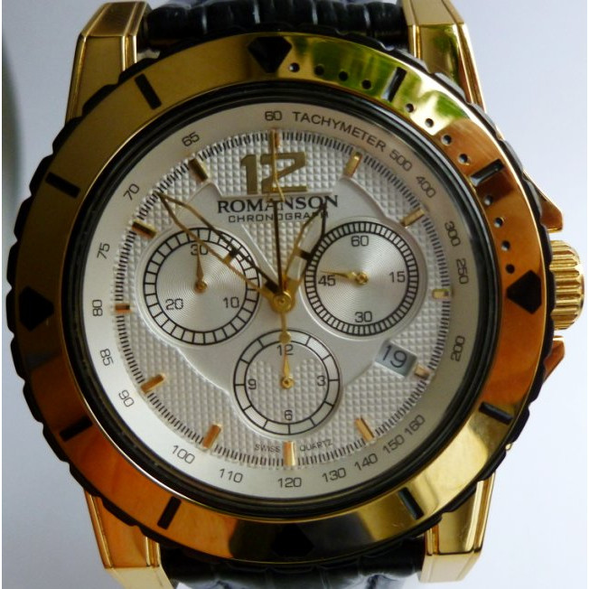 Мужские часы. Устойчивое к царапинам сапфировое стекло. Дополнительные функции: Хронограф (Стрелочный секундомер). Точный и надежный кварцевый механизм. Классический ремешок из натуральной кожи. Размеры часов: D-44mm H-10mm. Корпус изготовлен из нержавеющей стали. Водозащита часов 3 Атмосферы / 30м. Официальная гарантия 1 год. Торговая марка: Romanson Корея.