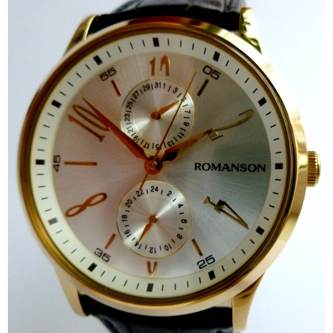 Мужские часы. Ударостойкое минеральное стекло. Точный и надежный кварцевый механизм. Классический ремешок из натуральной кожи. Размеры часов: d-41mm h-8mm. Корпус изготовлен из нержавеющей стали. Водозащита часов 3 Атмосферы / 30м. Официальная гарантия 1 год. Торговая марка: Romanson Корея.